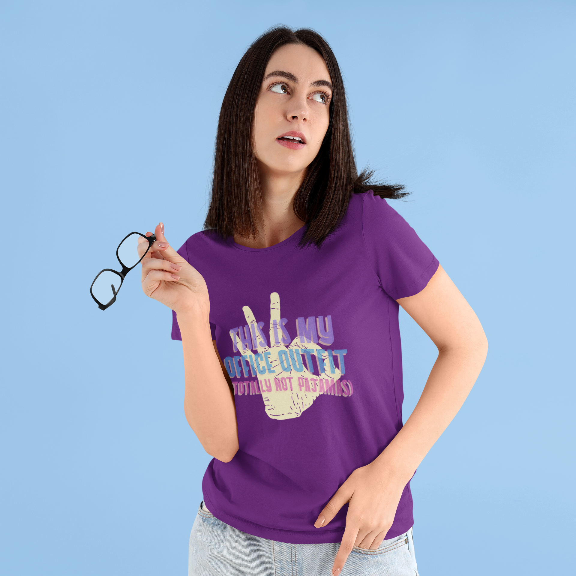 Bring humor to your work-from-home wardrobe with our “This Is My Office Outfit (Totally Not Pajamas)” Women’s T-Shirt. Designed for comfort and style, this black graphic tee is perfect for casual office days, Zoom calls, or laid-back weekends. The quirky hand-sign graphic and witty slogan make it a must-have for women who love playful fashion with a touch of sarcasm.