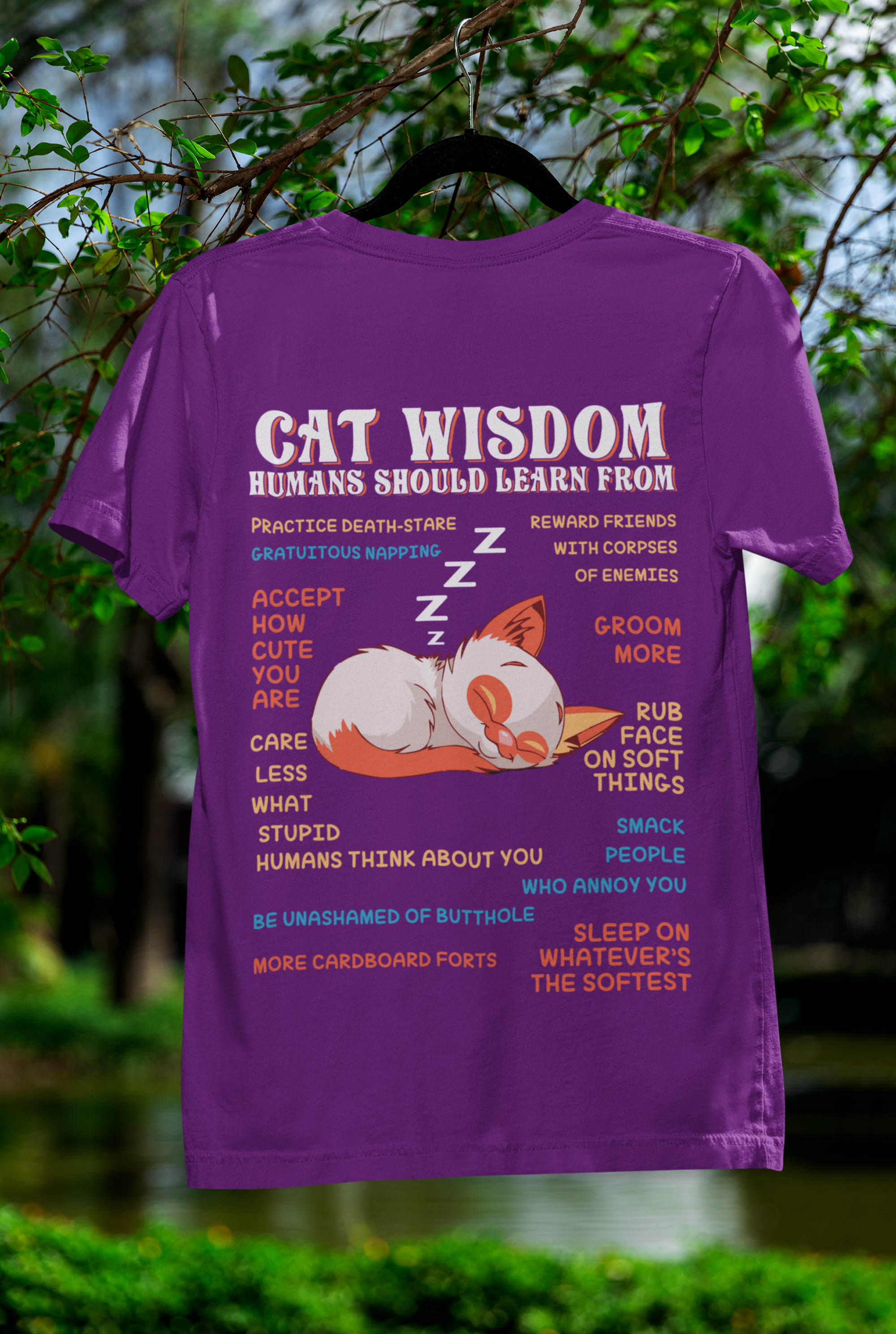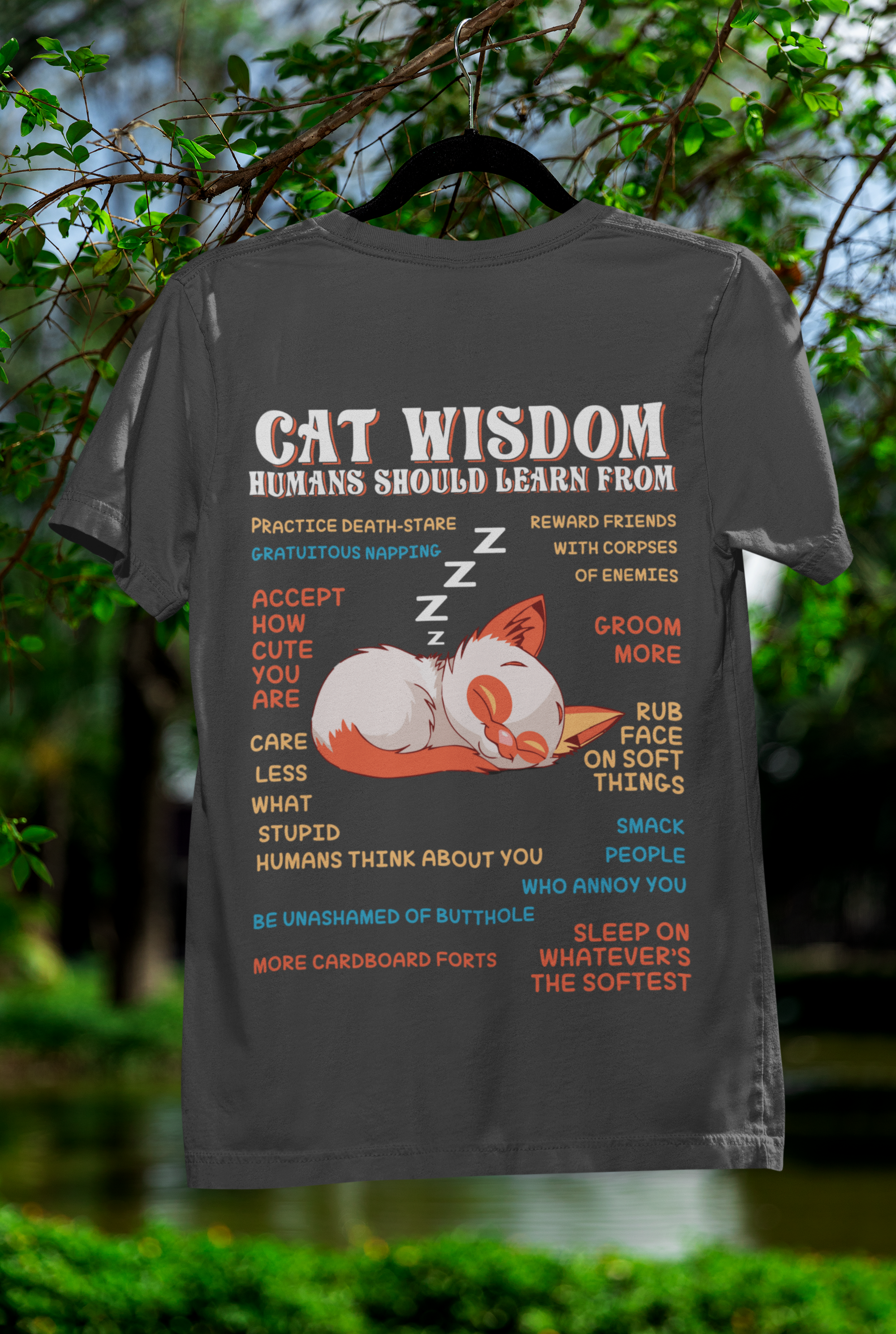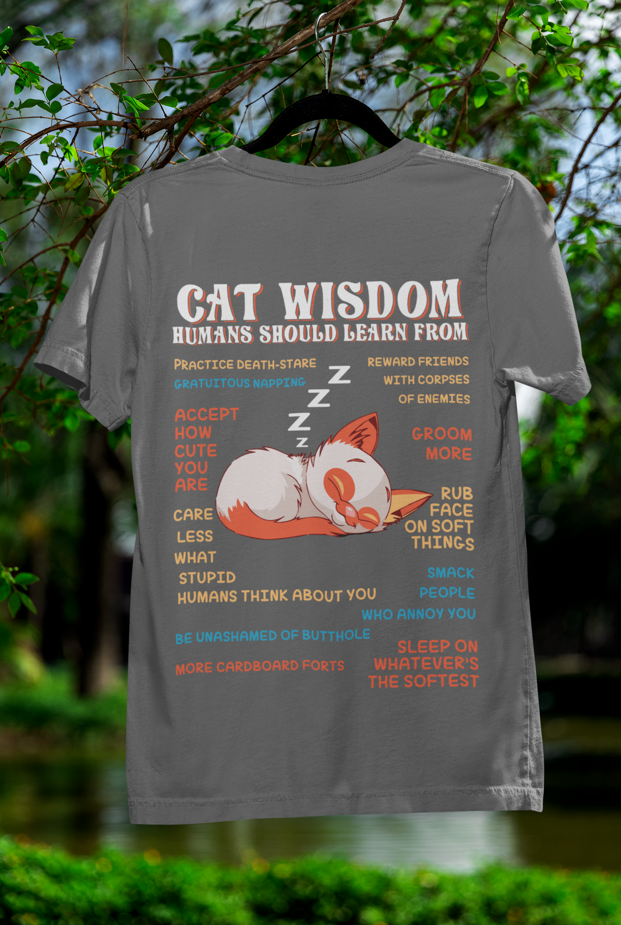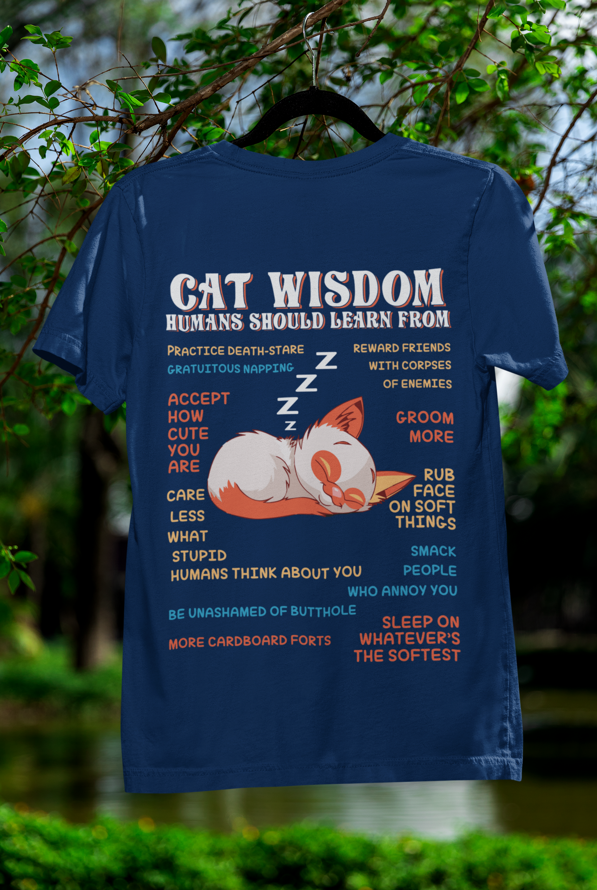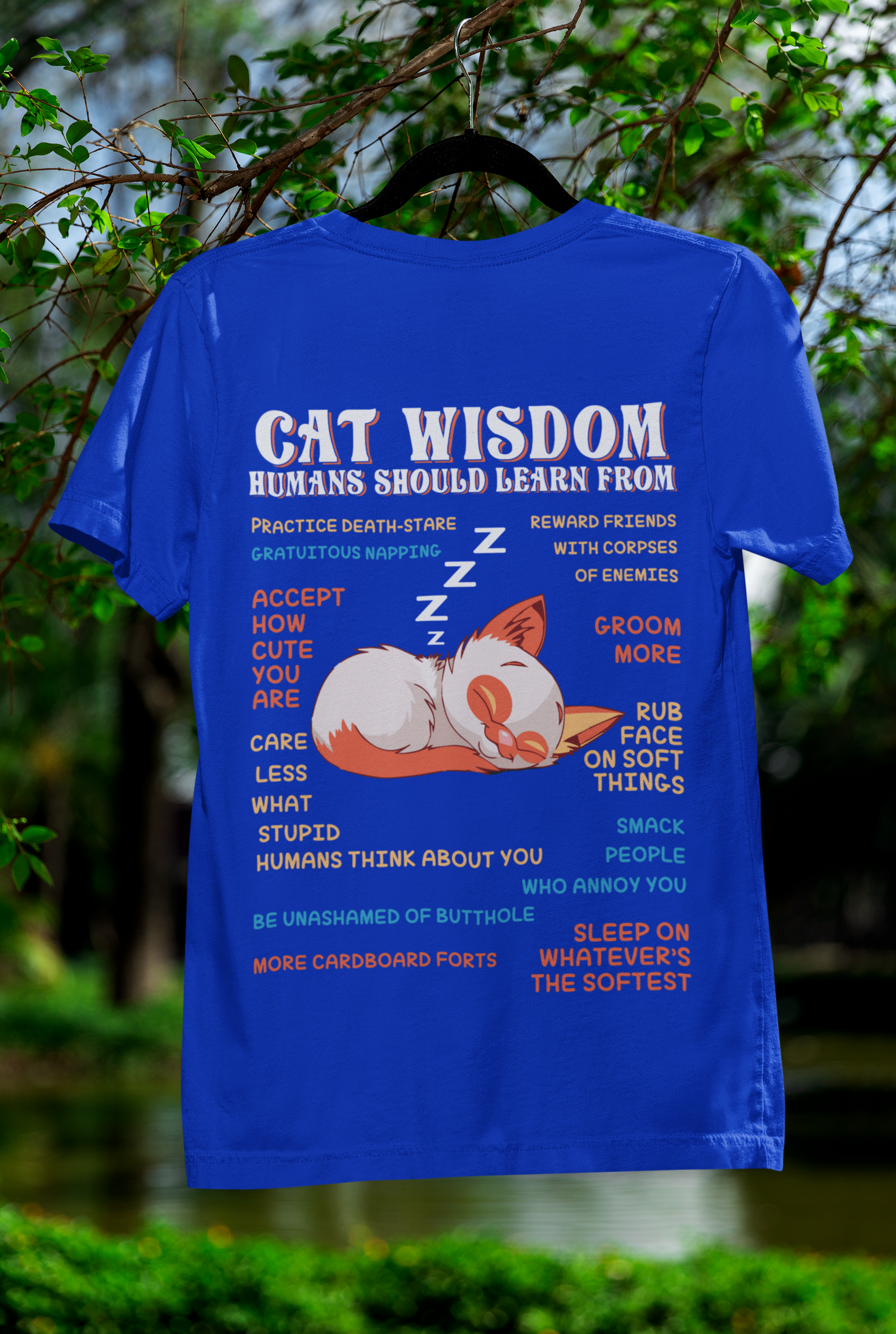 Embrace the whimsical charm of our Unisex Classic Crew T-Shirt, featuring a delightful "Cat Wisdom" design that blends humor with artistry. The vibrant orange and white sleeping cat illustration, accented by witty advice in contrasting blue and orange text, creates a playful and eye-catching statement piece perfect for any casual occasion.