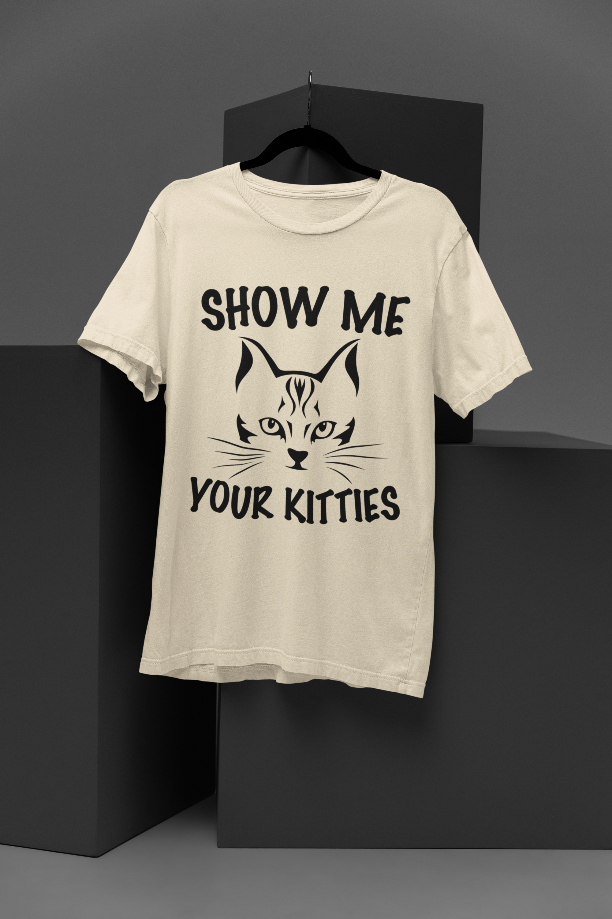 Embrace your playful side with our Unisex Classic Crew T-Shirt, featuring a humorous cat motif that combines bold graphics with witty text. The monochromatic black design ensures the "SHOW ME YOUR KITTIES" message and the expressive cat face pop with style and clarity, making it a must-have for cat enthusiasts and humor lovers alike.