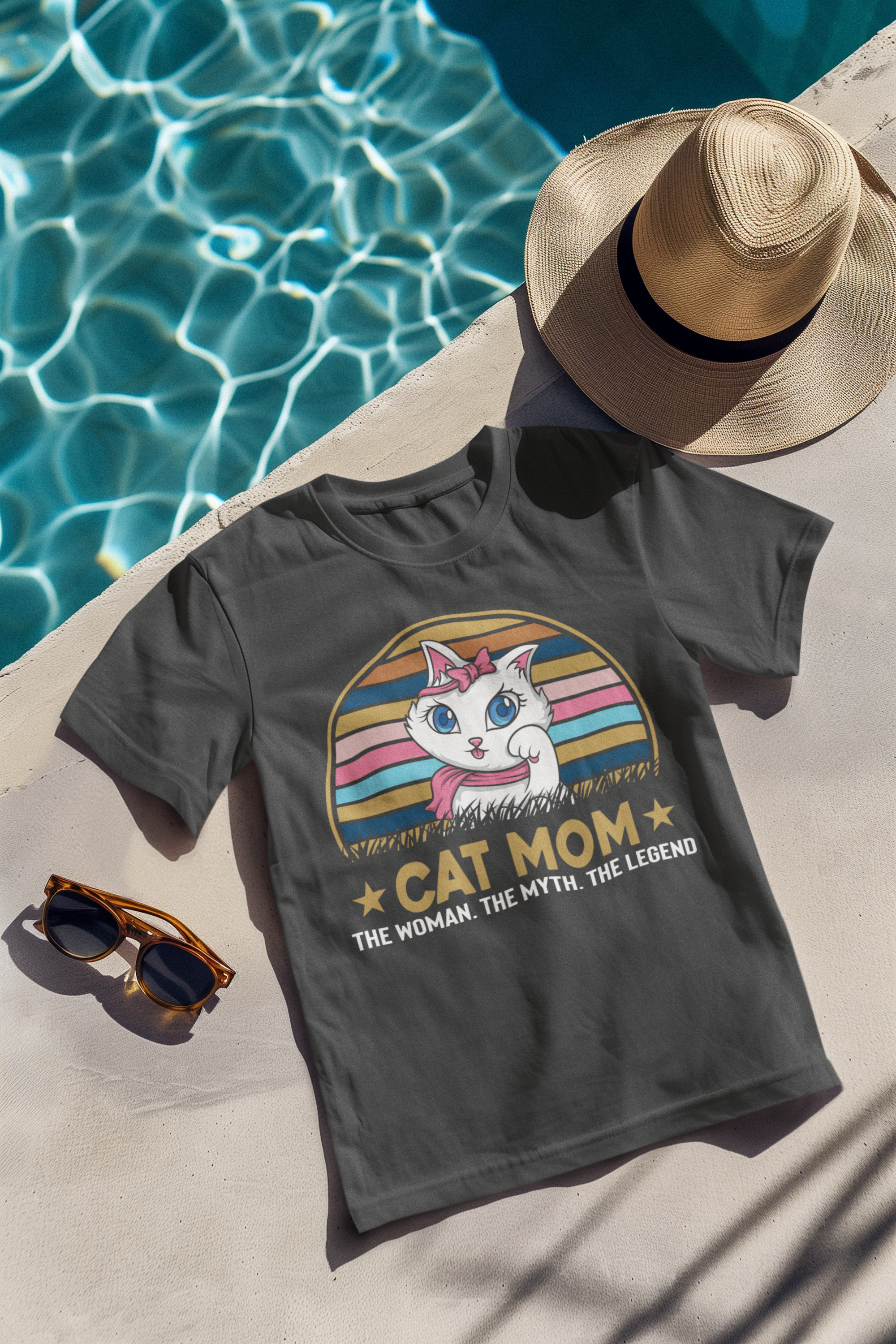 Embrace your playful side with our Unisex Classic Crew T-Shirt, featuring a whimsical "Cat Mom" design that combines a charming cartoon cat with bold typography. The pastel palette and retro sunset stripes create a vintage vibe, making it a perfect statement piece for proud pet parents.