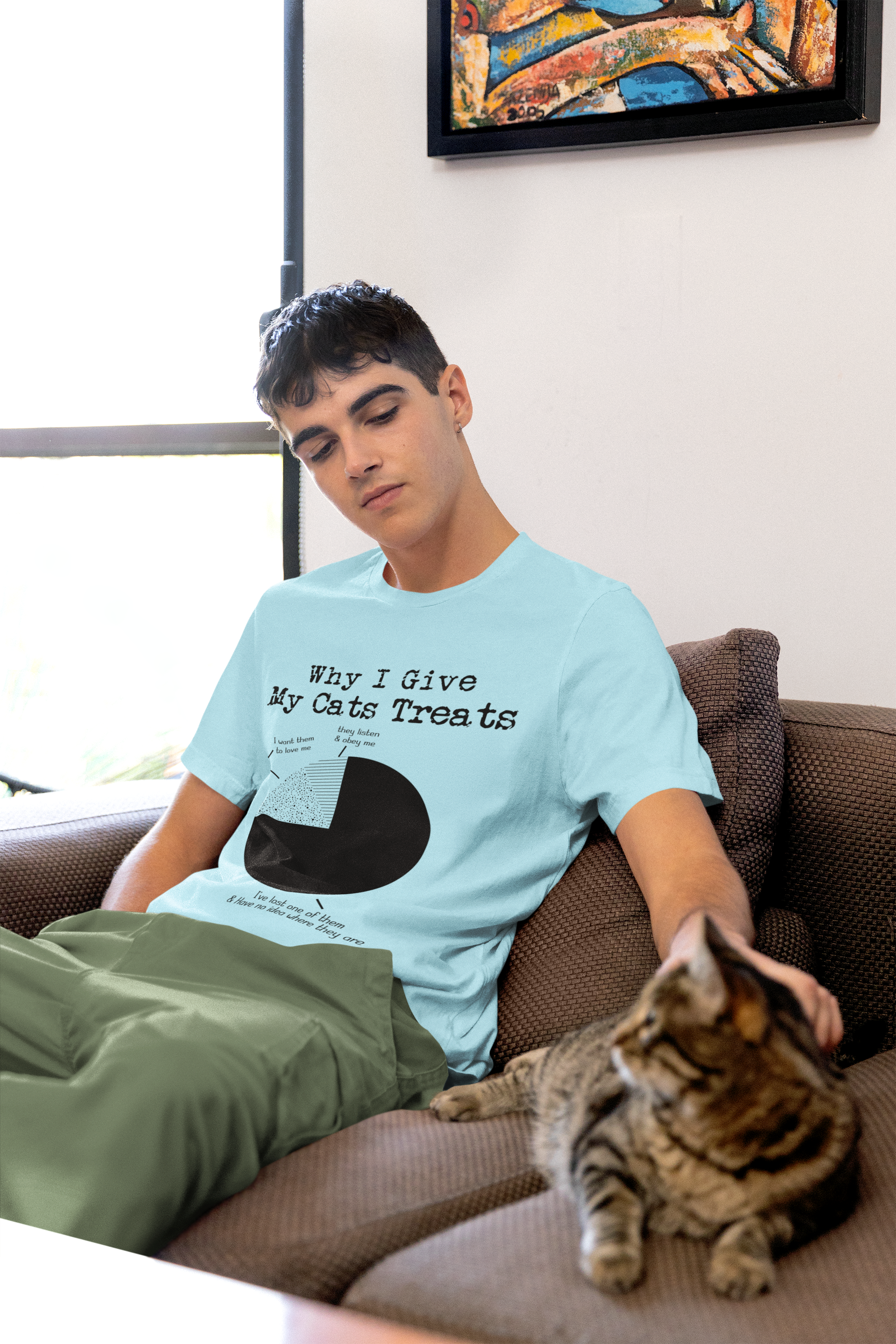 Embrace your love for feline antics with our 'Humorous Cat Pie Chart T-Shirt,' where a witty pie chart humorously dissects the reasons for treating your cats. The monochromatic black design ensures the playful text and graphics pop, making it a perfect conversation starter for any cat enthusiast.